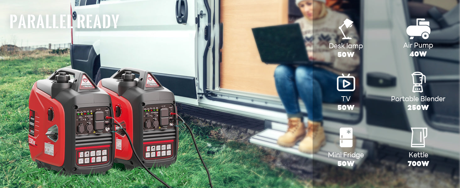 Extended Runtime: This portable generator comes with a 1.06-gallon fuel tank, allowing for up to 17 hours of operation at 25% load or 8.6 hours at 50% load. With parallel function and ECO mode, it provides long-lasting power—perfect for RVs, camping, and home backup emergencies.