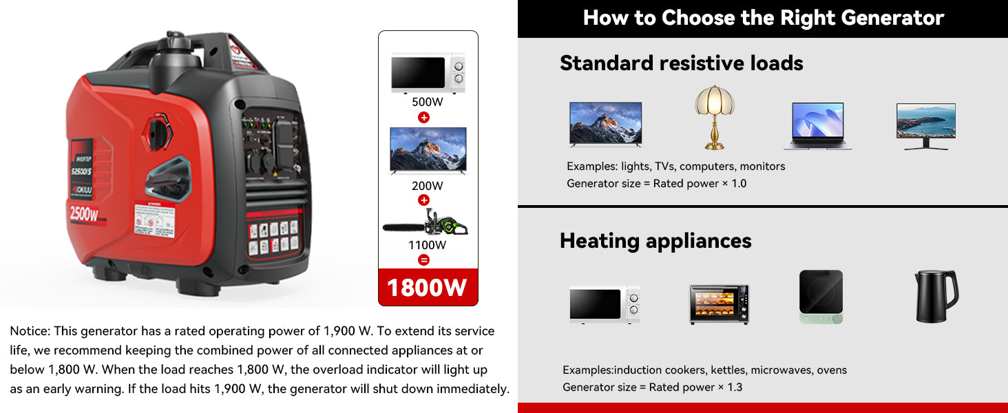 S2500iS Starting Wattage: 2500W, Running Wattage: 1900W. supports pure resistance devices like coffee maker, kettle, electric stove, juicer, electric grill under 1900W load capacity.
